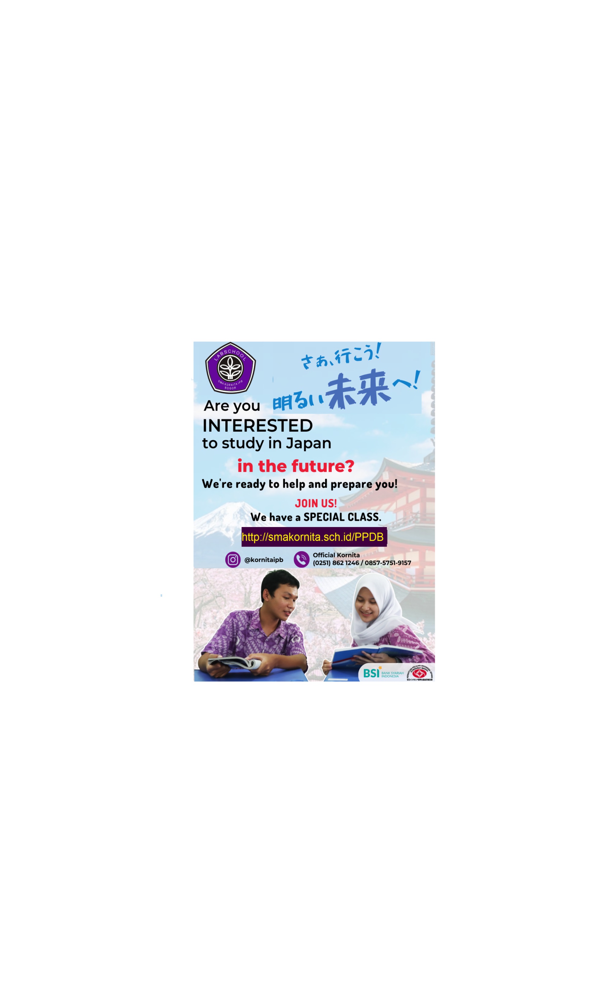 Selamat datang. Ahlan wa sahlan. Welcome. ようこそ (youkoso). 환영합니다 (hwanyeong hamnida). Wilujeng sumping di Website SMA KORNITA, Sekolah Impian Generasi Emas Berkarakter Unggul.